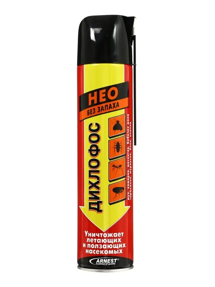 Аэрозоль от насекомых «Дихлофос НЕО» - это мощное средство для быстрого уничтожения тараканов, муравьев, клопов, блох, мух, комаров, ос и других насекомых. Действующее вещество тетраметрин обладает нокдаун-эффектом - вредители погибают в течение нескольких секунд после контакта с аэрозольным облаком. Большого баллона 600 см³ достаточно для обработки нескольких помещений или квартиры целиком.