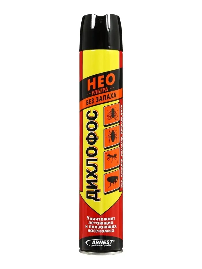Аэрозоль от летающих и ползающих насекомых «Дихлофос НЕО+» - это мощное универсальное средство для уничтожения всех видов насекомых в помещении. Большой баллон 400 см³ позволяет обработать квартиру, частный дом или дачу одной упаковкой. Эффективен против тараканов, муравьев, клопов, блох, мух, комаров, ос, моли и других вредителей.