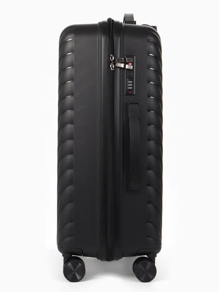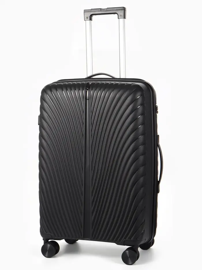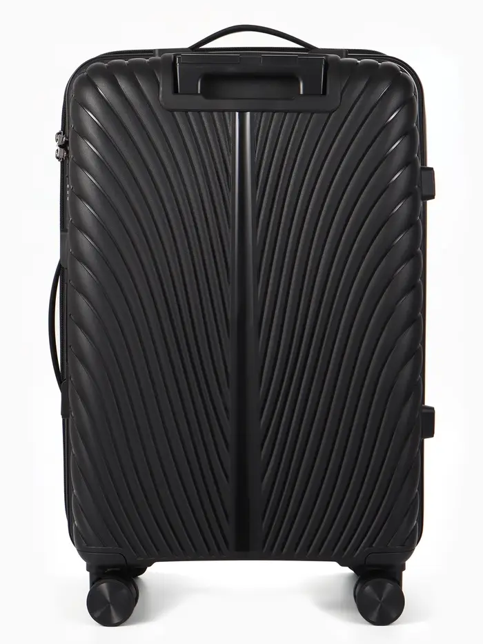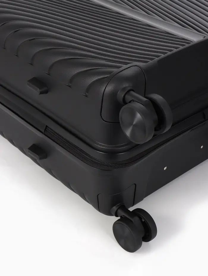 Этот чёрный чемодан на колёсах — ваш надёжный спутник в любых поездках. Классический дизайн унисекс и практичный полипропиленовый корпус выдерживают требования современного путешествия. Четыре поворотных колеса обеспечивают манёвренность и лёгкость перемещения по перрону или аэропорту.