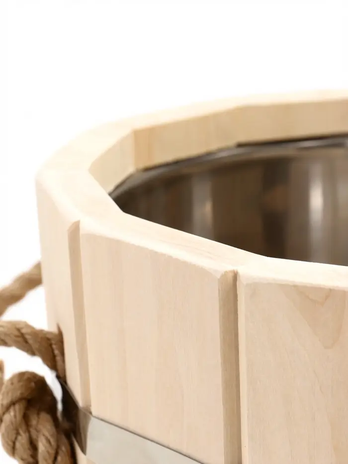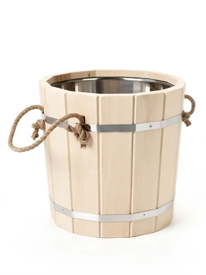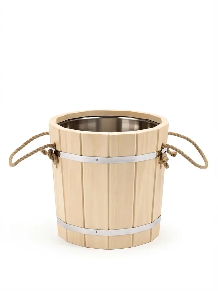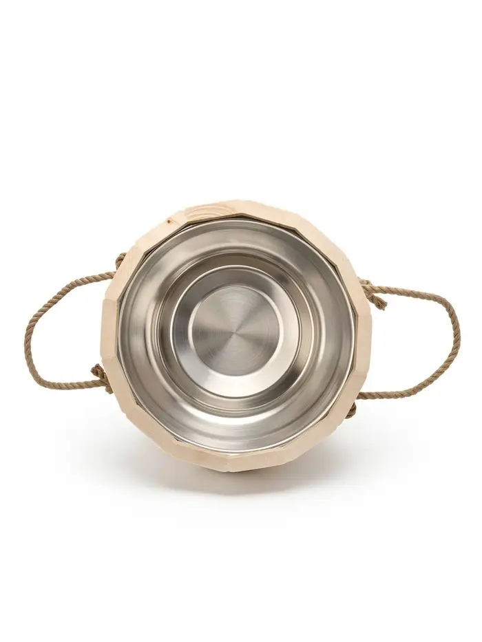 Ведро-запарник на 12 литров позволяет удобно и быстро подготовить веник к парению, чтобы он стал мягким и полностью раскрыл свои свойства. Благодаря нержавеющей вставке вода дольше остаётся внутри без контакта с древесиной, а сам процесс запаривания проходит аккуратно и без лишних хлопот.