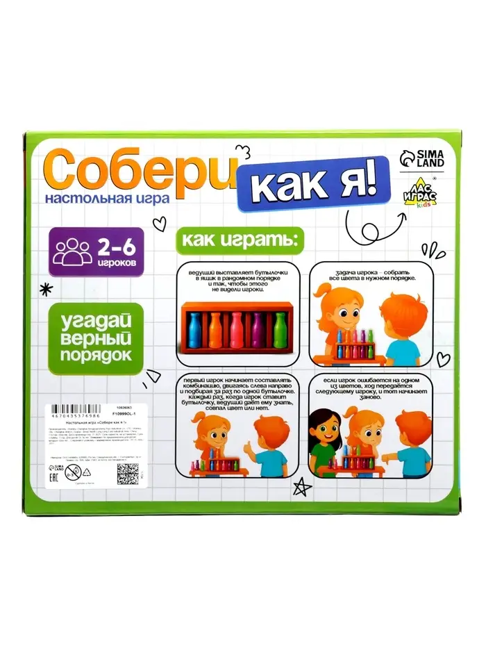 Угадай комбинацию и проверь себя шаг за шагом! Развивающая игра «Собери как я» — это простая и увлекательная настольная игра на логику и внимание для детей от 3 лет. Ребёнок не просто повторяет, а пробует, ошибается и находит правильный порядок цветов, ориентируясь на подсказки ведущего.