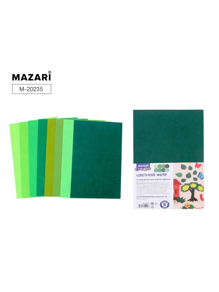 Фетр «Зеленый» 8 листов, 8 цветов, формат А4, толщина 1 мм