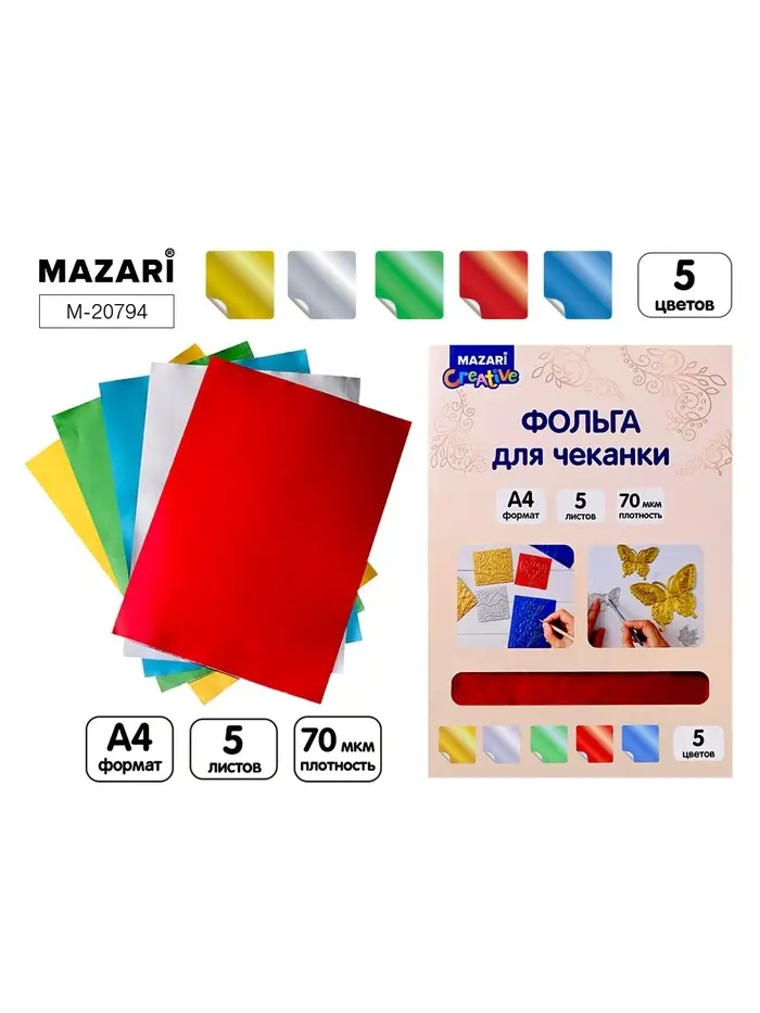 Фольга для чеканки, ассорти 5 цветов: золото, серебро, красный, синий, зеленый, формат А4