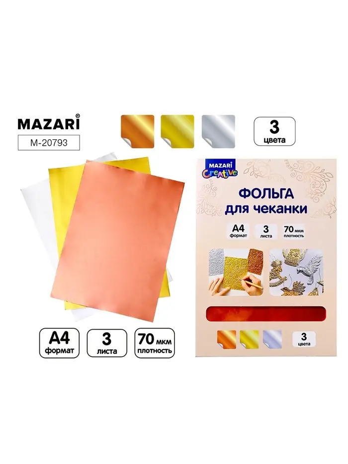 Фольга для чеканки «Золото, серебро, медь», 3 листа, формат А4