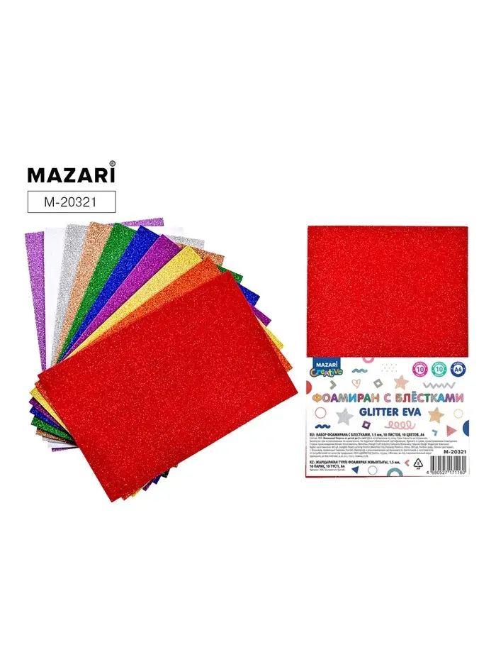 Фоамиран цветной с блестками, набор 10 листов, 10 цветов, формат А4, толщина 1.5 мм
