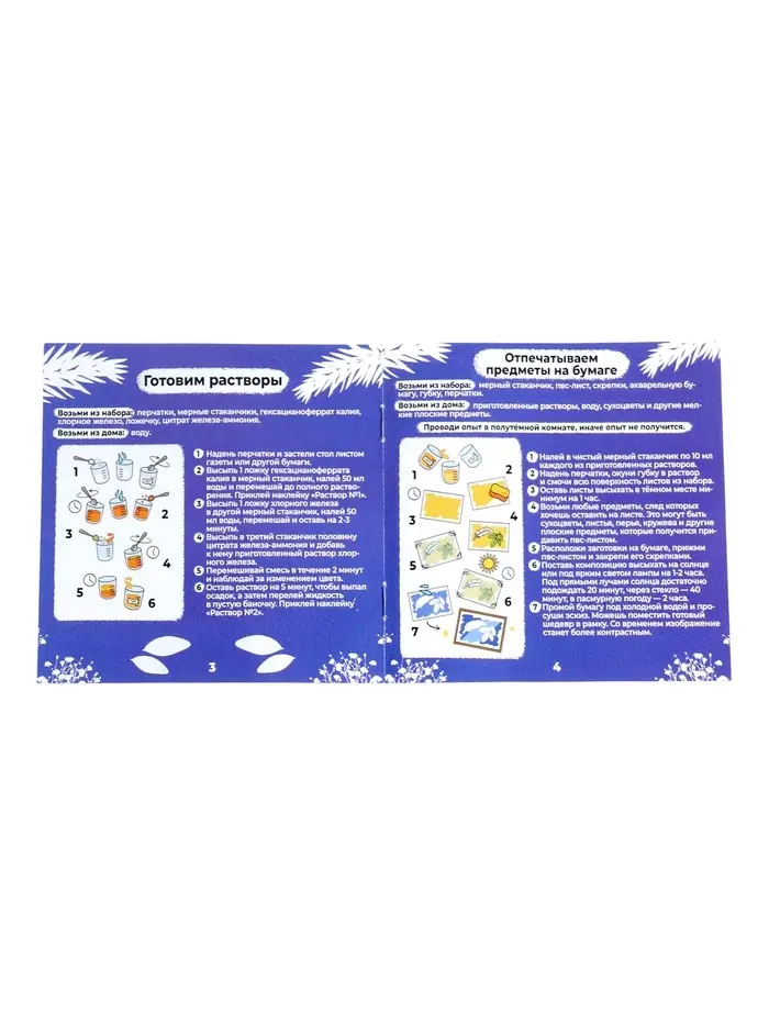 - Знакомство с техникой цианотипии: Набор помогает освоить один из самых узнаваемых способов контактной печати. Листья, цветы, трафареты и силуэты оставляют на фоне белые следы, а результат выглядит как авторская открытка, постер или декоративный принт.