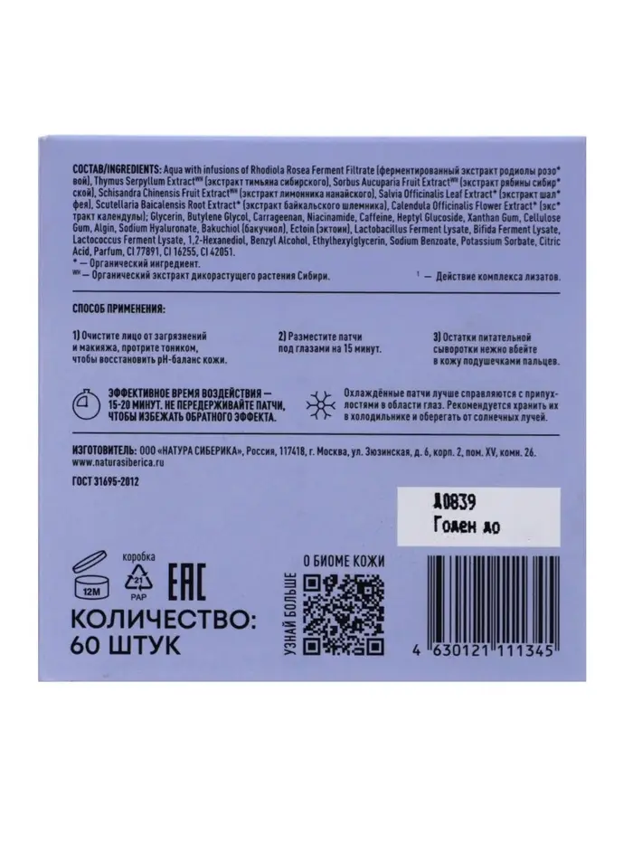 Патчи для кожи вокруг глаз с бакучиолом и эктоином NS LAB «Регенерация», 60 шт.