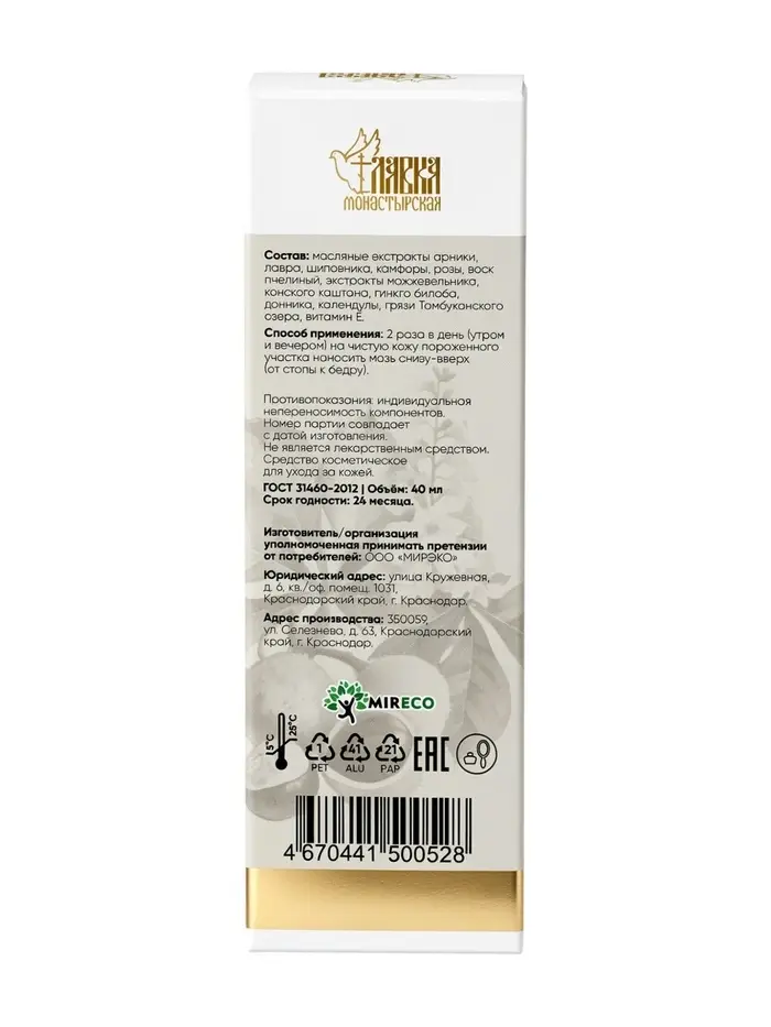 Крем-мазь при варикозе «Монастырская лавка», пластик, 40 мл