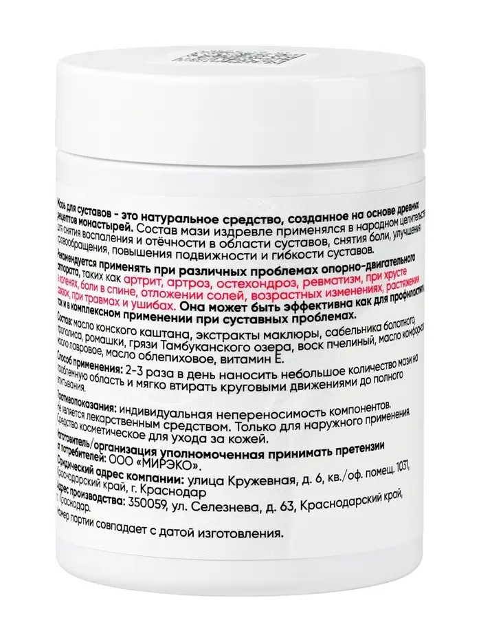 Крем-мазь для здоровья суставов «Монастырская лавка», пластик, 100 мл