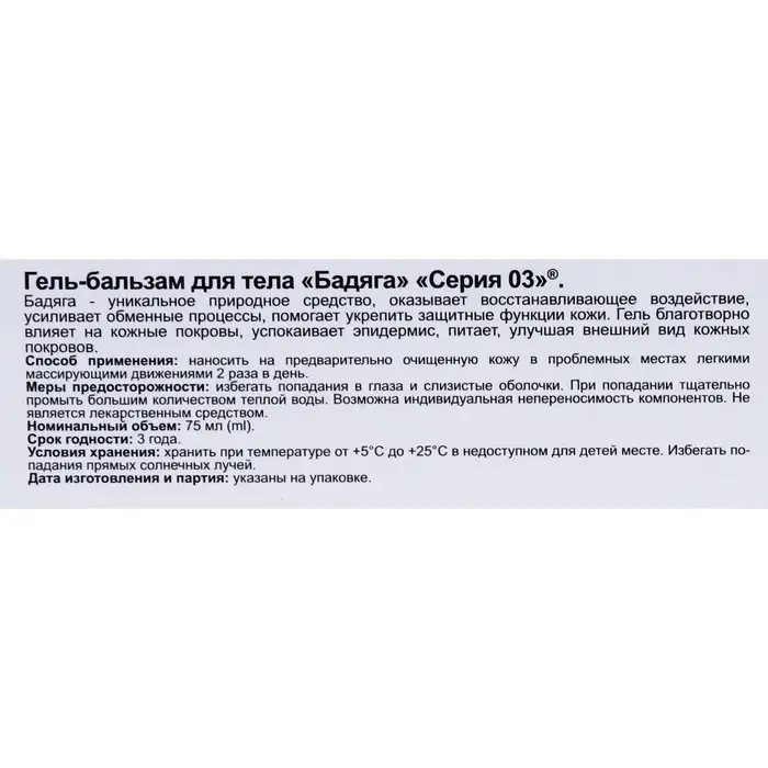 Способ применения: наносить гель-бальзам на кожу лёгкими массирующими движениями 2–3 раза в день.