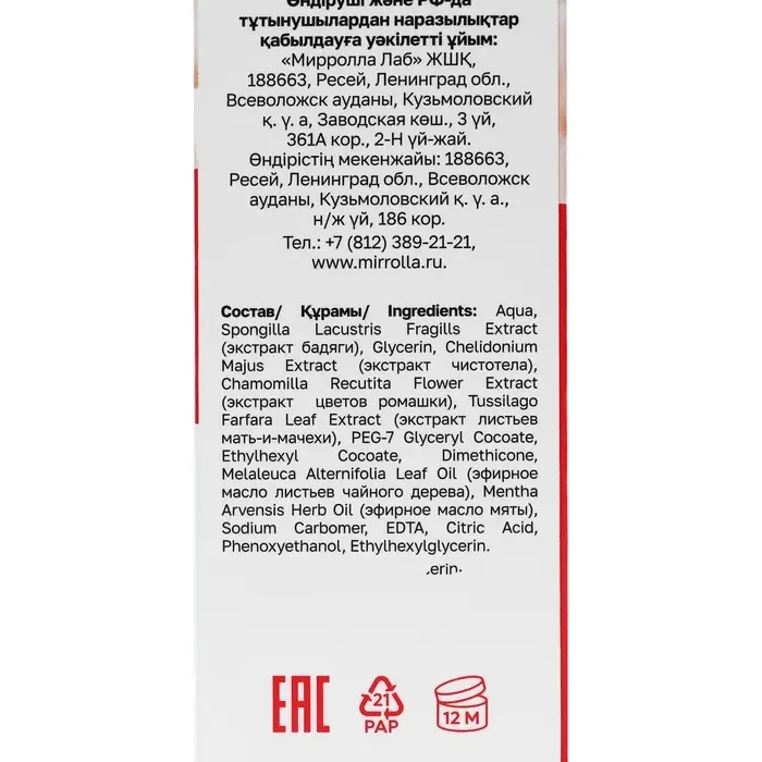 Состав: aqua, Spongilla Lacustris Fragilis Extract (Экстракт Бадяги), Glycerin, Chelidonium Majus Extract (экстракт Чистотела), Chamomilla Recutita Flower Extract (экстракт цветов Ромашки), Tussilago Farfara Leaf Extract (экстракт листьев Мать-и-мачехи), PEG-7 Glyceryl Cocoate, Ethylhexyl Cocoate, Cyclomethicone, Mentha Arvensis Herb Oil (э.м. травы Мяты), Melaleuca Alternifolia Leaf Oil (э.м. листьев Чайного дерева), Carbomer, EDTA, Citric Acid, Diazolidinyl Urea, 2-bromo-2-nitropropane-1,3-diol.