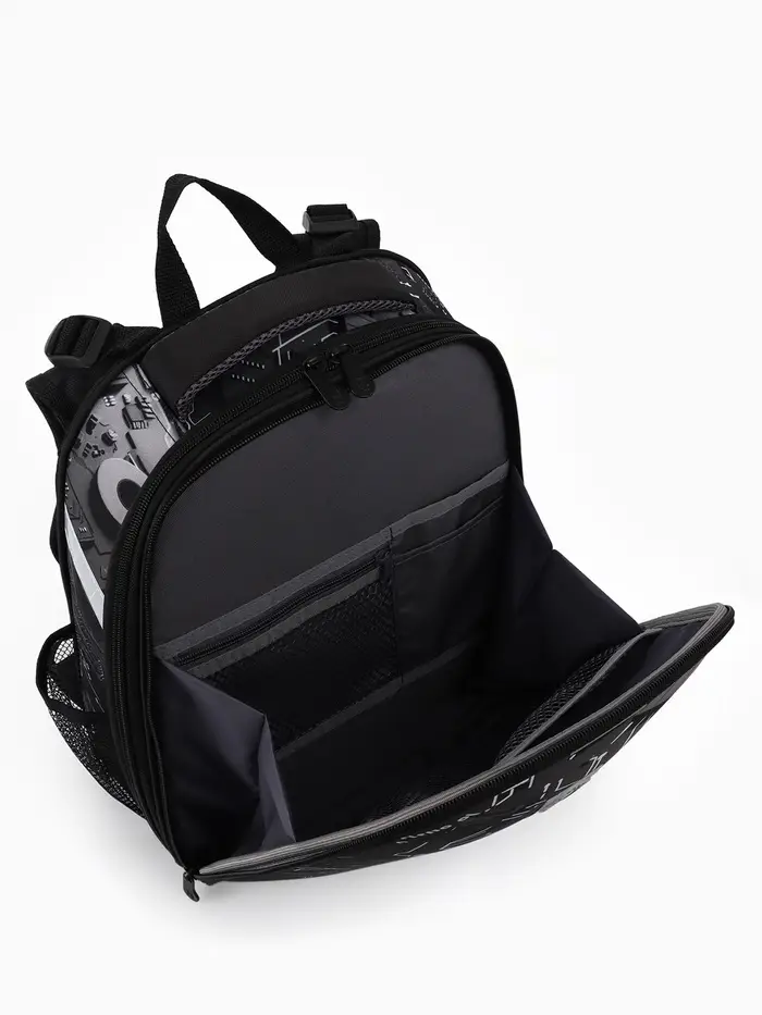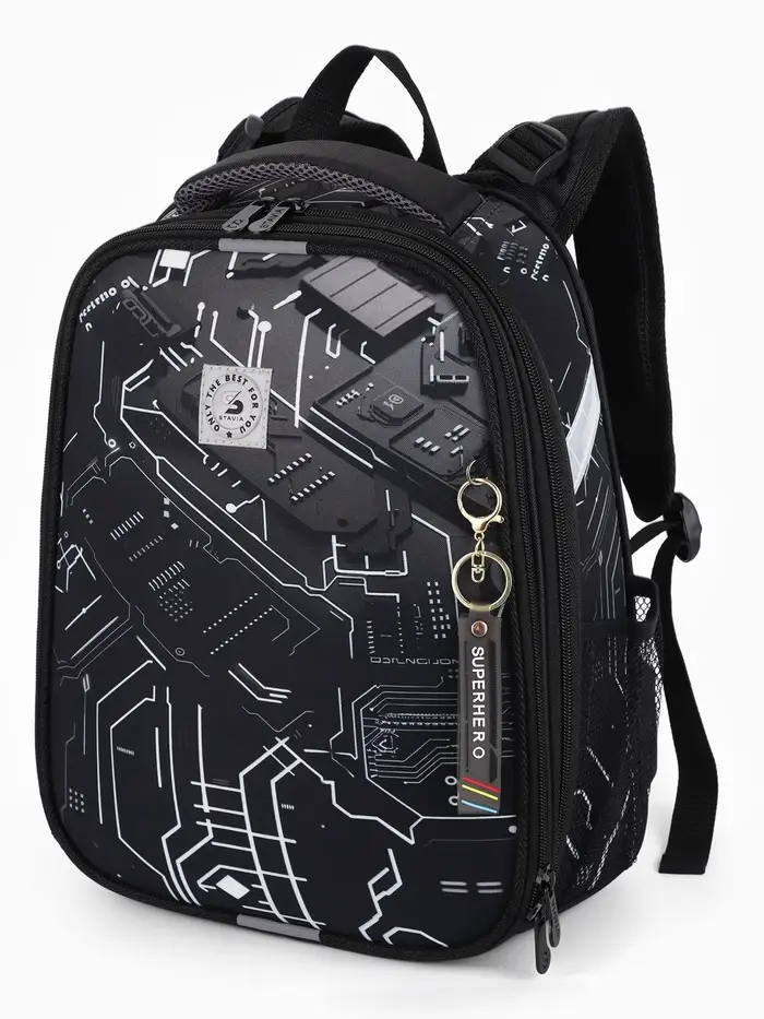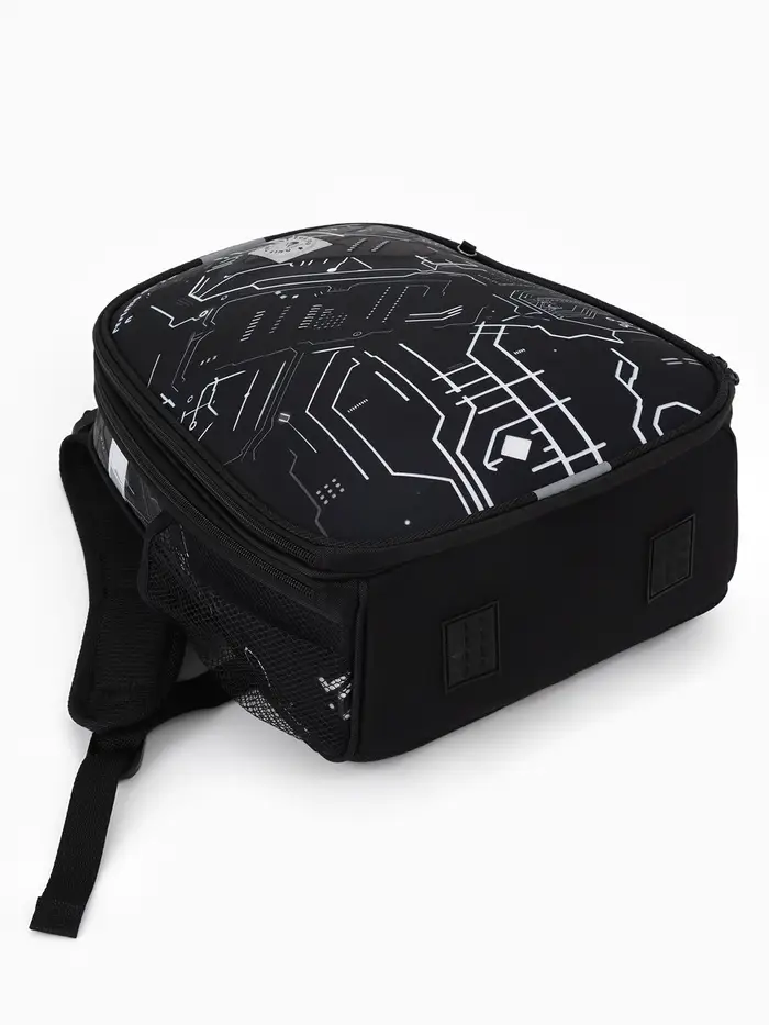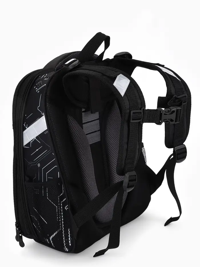 Школьный рюкзак с абстрактным принтом — практичный вариант для мальчика, которому близка тема технологий и современного дизайна. Чёрная основа выглядит сдержанно и универсально, а графический рисунок напоминает узоры электронных схем, добавляя рюкзаку характер и индивидуальность. Такой аксессуар органично вписывается в школьные будни и поддерживает ощущение собранности.