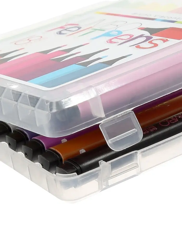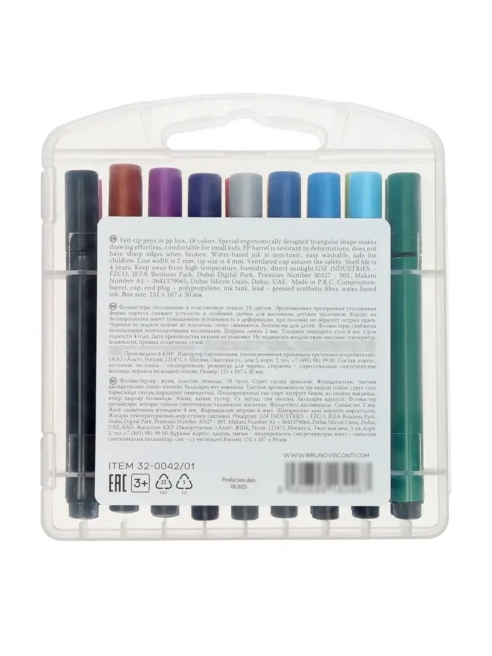 Фломастеры поставляются в прочном пластиковом пенале, который защищает их от повреждений и упрощает хранение. Вентилируемые колпачки повышают безопасность использования, а насыщенные чернила обеспечивают яркое и равномерное нанесение цвета. Подходят для дома, школы и творческих занятий.