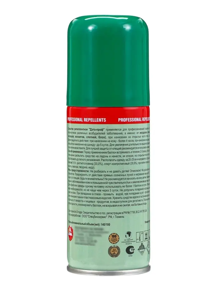 Репеллентный аэрозоль «Дэта-Проф 3 в 1» - это эффективное средство для отпугивания комаров, мошек и клещей на природе и в городе. Специальная формула обеспечивает длительную защиту от трех видов кровососущих насекомых одновременно. Удобный аэрозольный формат позволяет быстро обработать кожу и одежду, а экономичный объем 140 мл рассчитан на длительное использование.