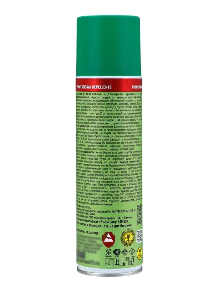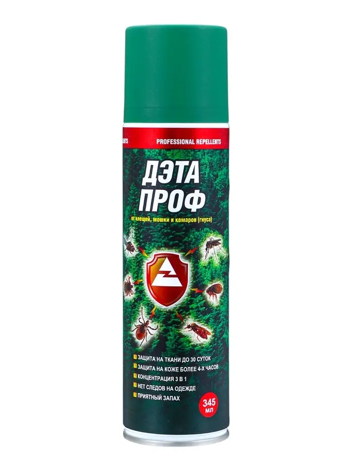 Репеллентный аэрозоль «Дэта-Проф 3 в 1» - это эффективное средство для отпугивания комаров, мошек и клещей на природе и в городе. Специальная формула обеспечивает длительную защиту от трех видов кровососущих насекомых одновременно. Максимальный объем 345 мл рассчитан на длительное использование всей семьей и на весь сезон. Удобный аэрозольный формат позволяет быстро обработать кожу и одежду.
