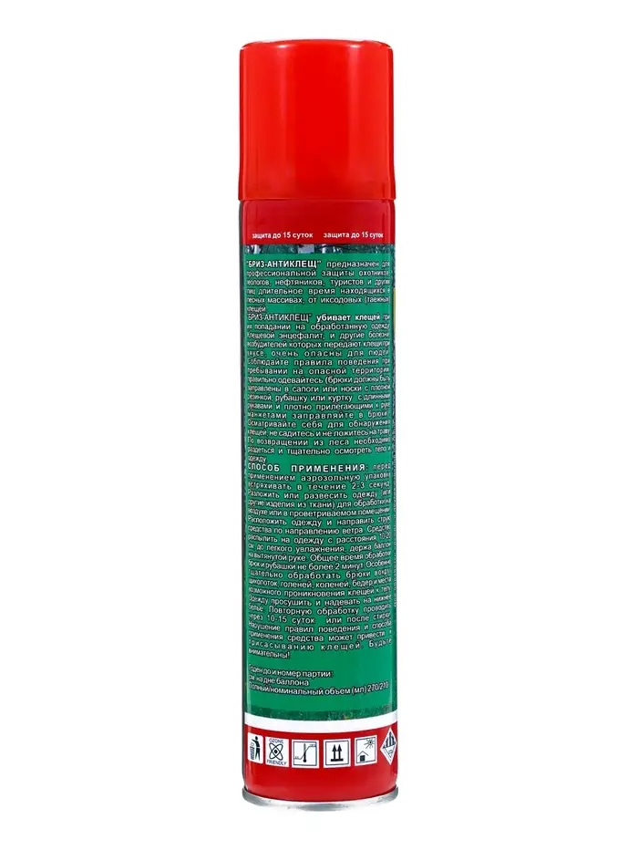 Аэрозоль «Бриз Антиклещ» - это эффективное средство для уничтожения и отпугивания иксодовых клещей - переносчиков опасных заболеваний. Специальная формула обеспечивает длительную защиту при контакте с обработанной одеждой. Большой баллон 270 мл рассчитан на многократное использование для всей семьи. Идеально подходит для использования в лесу, на охоте, рыбалке и в походах.