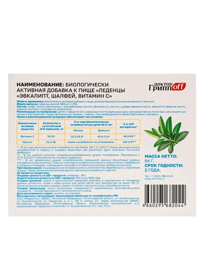 Леденцы Эвкалипт, Шалфей, Витамин С «Доктор ГриппOFF», 20 штук