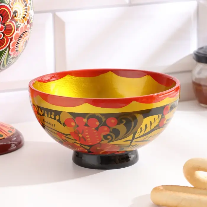 Этот предмет станет не только функциональным элементом кухни, но и ярким акцентом в интерьере, придавая столу особую атмосферу. Пиала прекрасно подойдёт как для домашнего использования, так и в качестве оригинального подарка ценителям русского народного искусства.