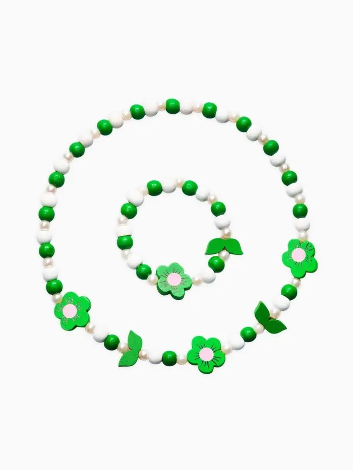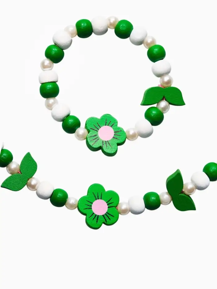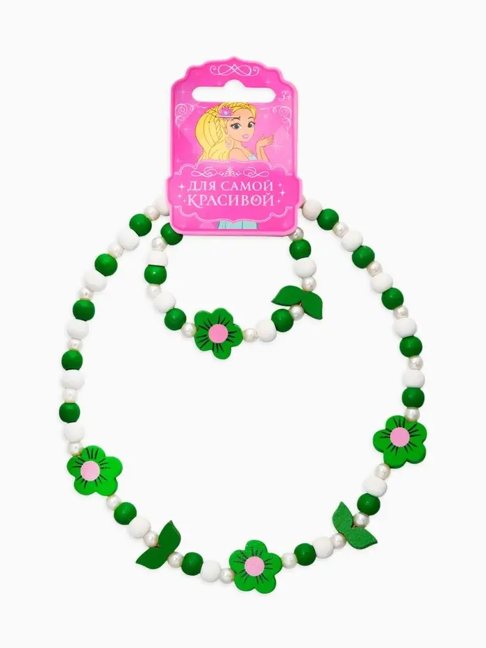 Яркий комплект с цветочными элементами создаёт настроение лёгкости и игры, превращая любой образ в маленький праздник. Бусы длиной 40 см и аккуратный браслет диаметром 6 см гармонично сочетаются между собой и дополняют наряд, добавляя свежие зелёные акценты.