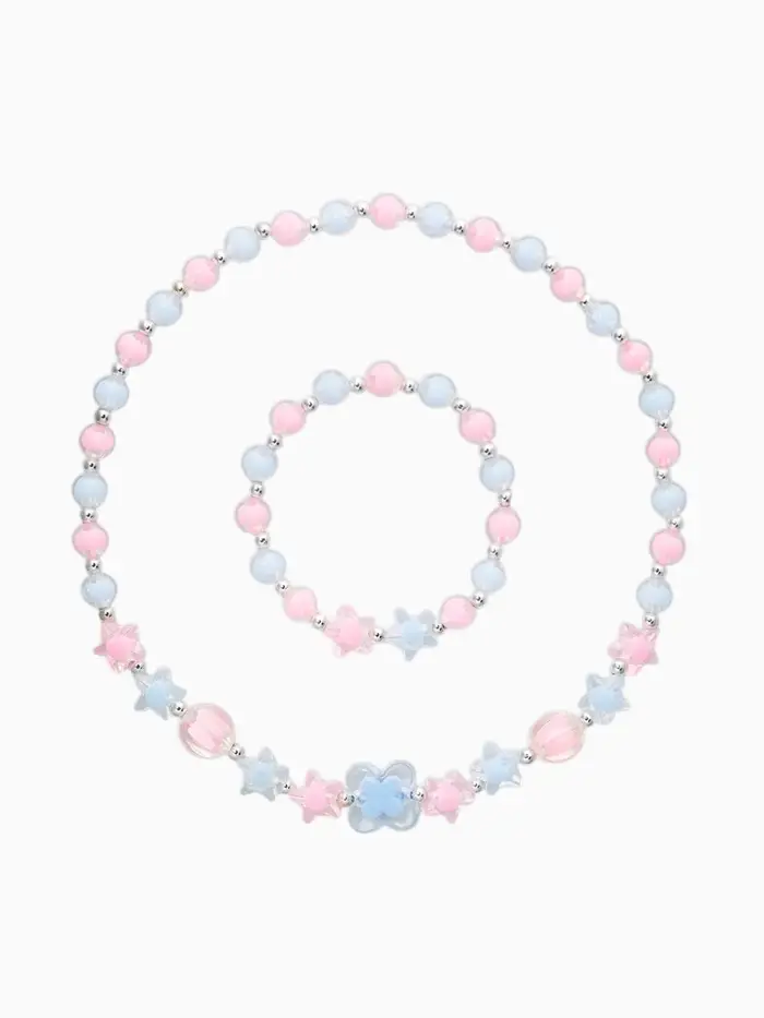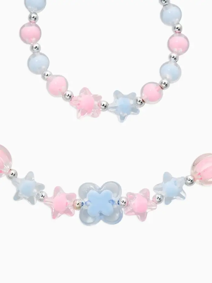 Лёгкое настроение праздника и немного космической фантазии — именно такое впечатление создаёт этот детский комплект украшений. Нежное сочетание розового и голубого оттенков делает образ воздушным и гармоничным, а аккуратные формы бусин добавляют игривости и уюта в повседневный стиль маленькой модницы.