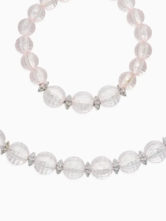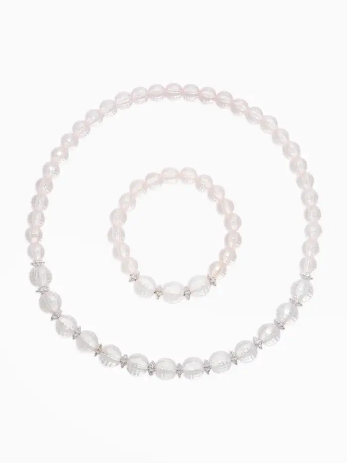 Набор состоит из двух предметов — бус и браслета, выполненных в едином стиле с кристальной тематикой. Прозрачные элементы мягко переливаются на свету, добавляя образу воздушности и нежности. Благодаря лёгкому пластиковому материалу украшения комфортны в носке и не создают ощущения тяжести, что особенно важно для ребёнка.