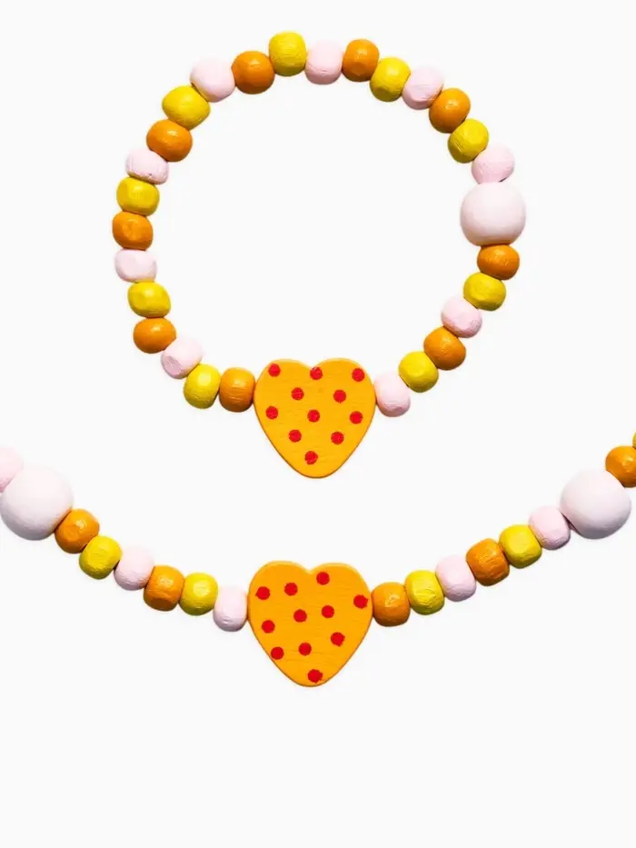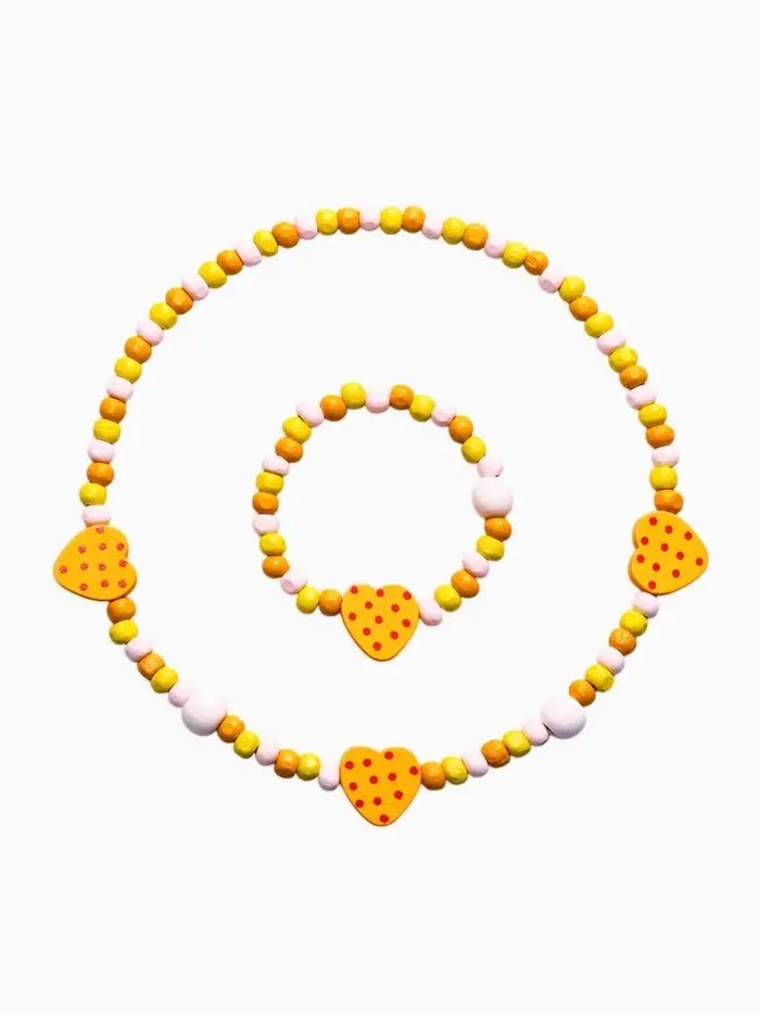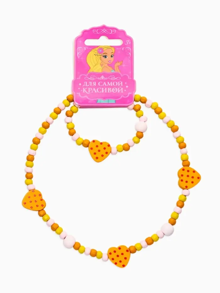 Яркий акцент в образе маленькой модницы — комплект с очаровательными сердечками, который сразу привлекает внимание и поднимает настроение. Тёплый жёлтый оттенок в сочетании с милыми формами делает аксессуары по-настоящему выразительными и легко сочетаемыми с повседневной одеждой.