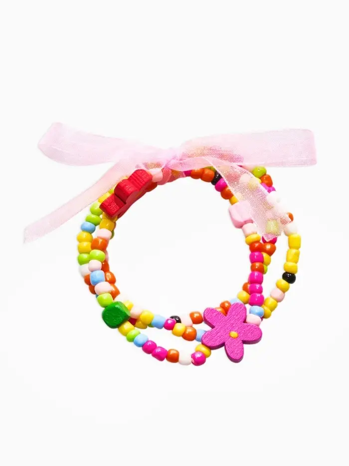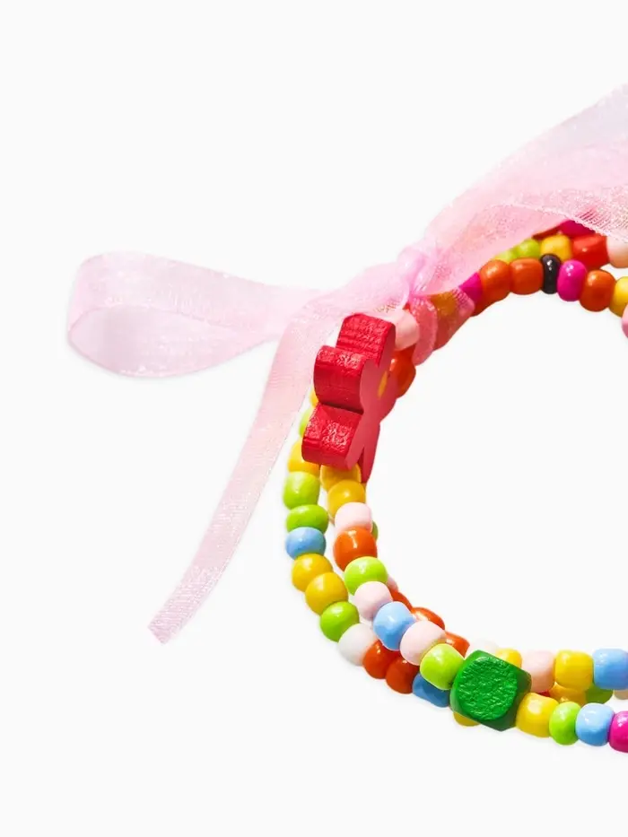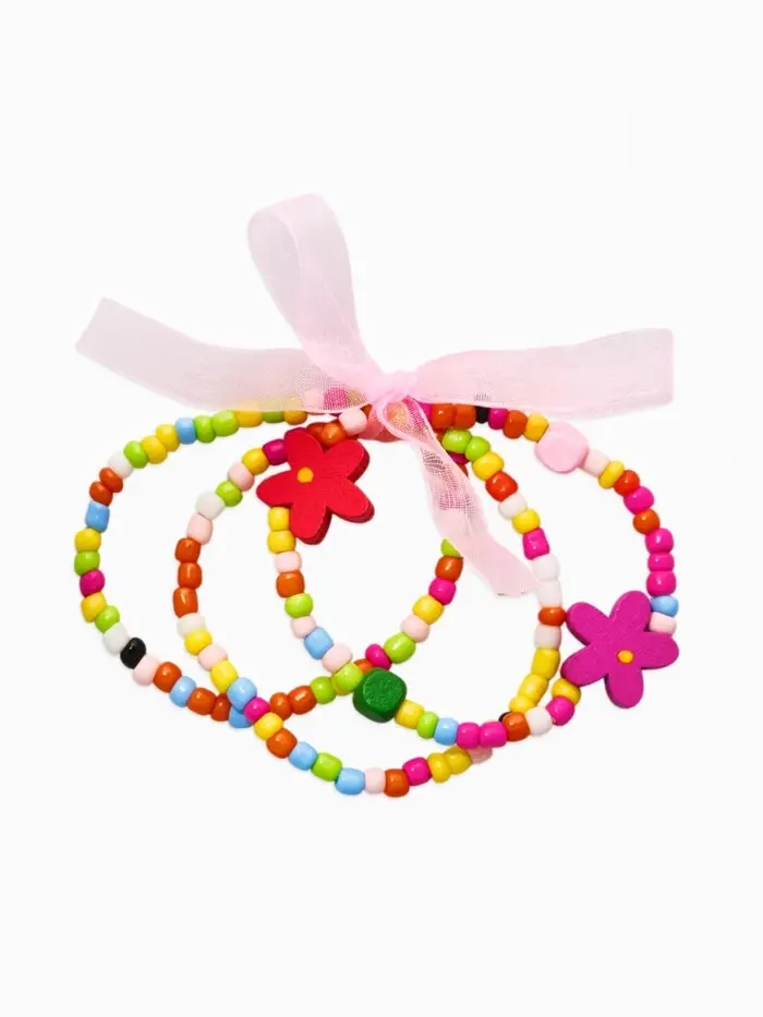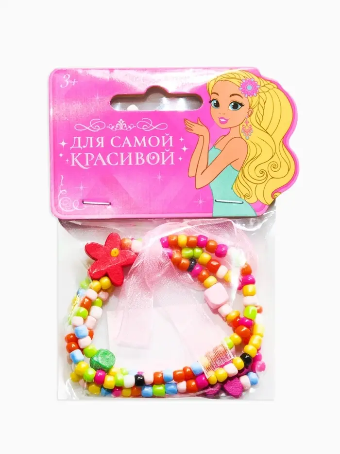 Браслеты выполнены из гладких пластиковых бусин, собранных в эластичную форму без застёжек — их легко надевать и снимать даже самостоятельно. Декоративные элементы в виде бантика и цветка добавляют образу нежности и игривости, делая аксессуар особенно привлекательным для девочек.
