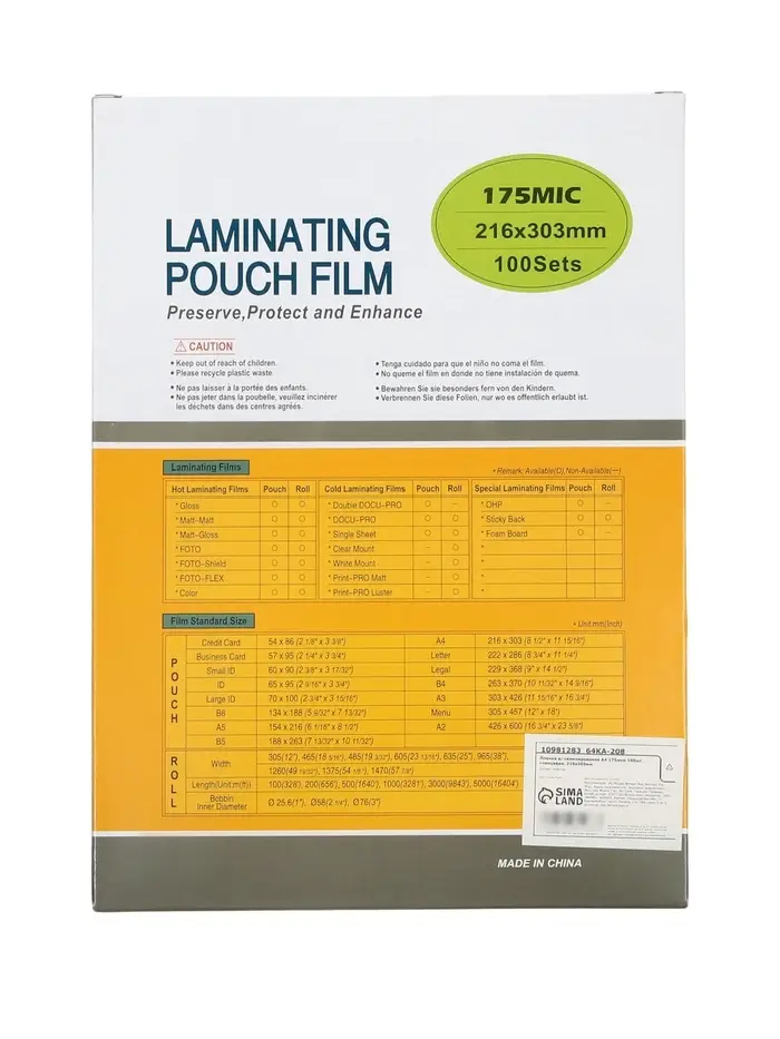 Пленка д/ламинирования A4 175 мкм 100 шт., глянцевая, 216×303 мм