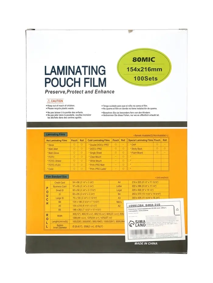 Пленка д/ламинирования A5 80 мкм 100 шт., глянцевая, 154×216 мм