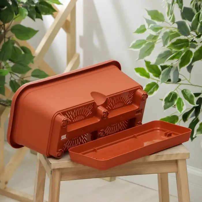 - Удобный размер для компактных пространств: с длиной 40 см контейнер идеально подходит для небольших балконов, подоконников или кронштейнов. Его можно с лёгкостью перемещать, подстраивая под текущие нужды.