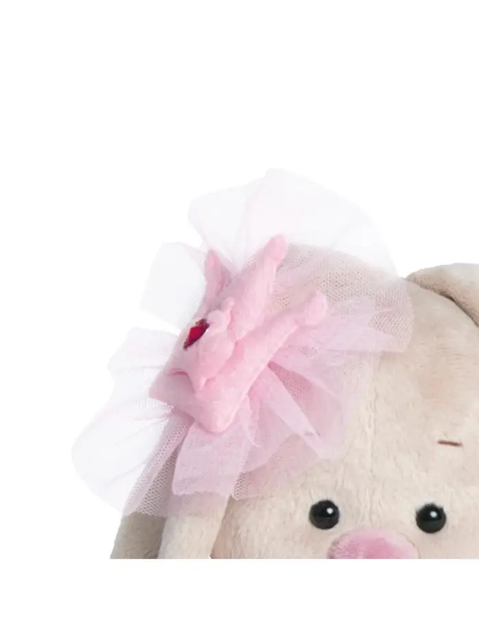 - На зайке пышная юбочка-пачка из нежно-розовой сеточки на атласном пояске. На ушке брошка в виде короны с сеточкой и стразом в виде сердечка.