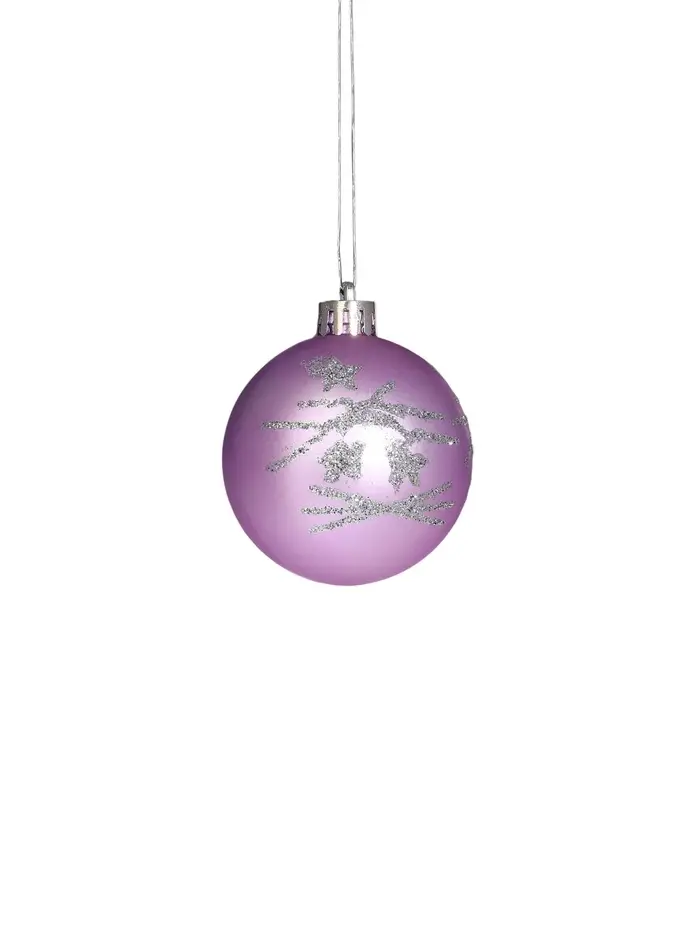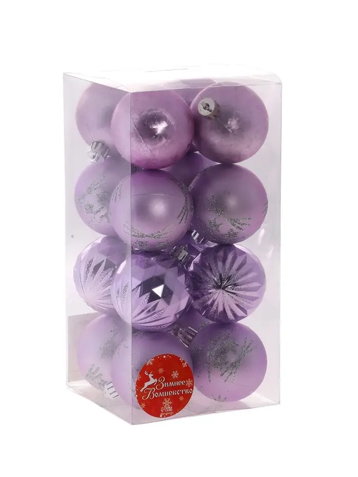Эти однотонные сиреневые шары в наборе помогают оформить ёлку сдержанно и элегантно. Их оттенок напоминает о нежных зимних рассветах, а форма и размер дают свободу для комбинирования с другими украшениями и гирляндами.