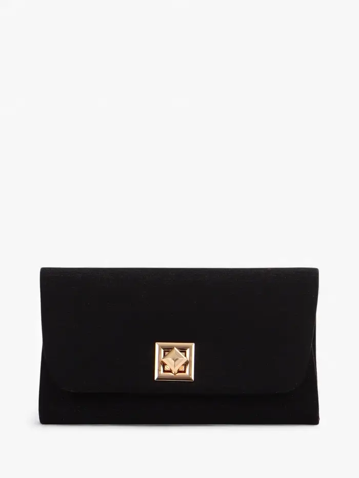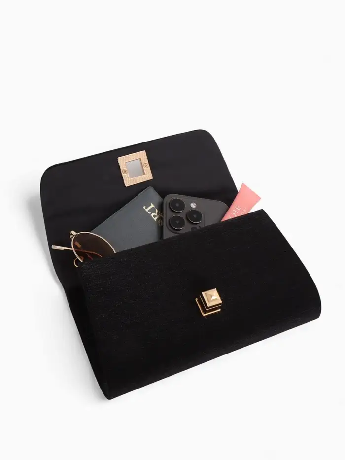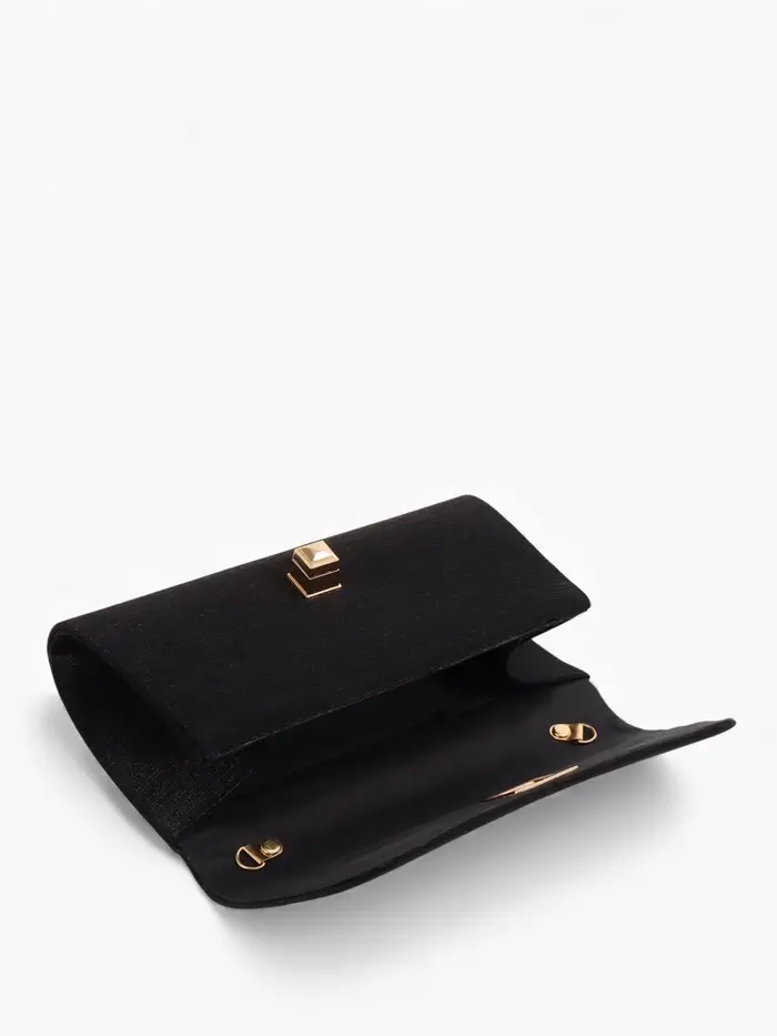 - Изысканный дизайн: Созданная из текстиля и искусственной кожи, сумка сочетает в себе классический черный цвет и золотую фурнитуру. Строгие линии делают ее подходящей для особых случаев.
