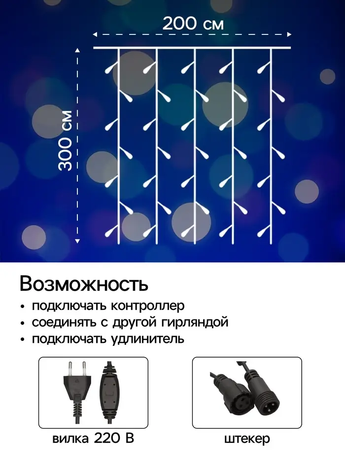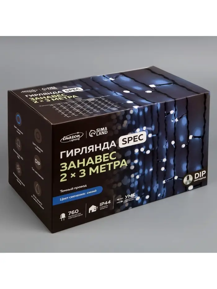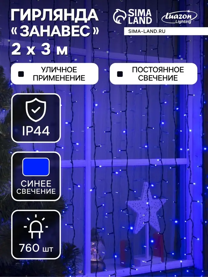 Гирлянда «Занавес» 2×3 м, IP44, УМС, тёмная нить, 760 LED, свечение синее, 220 В