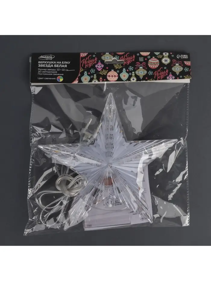 Светодиодная верхушка на ёлку «Звезда белая», 22 см, 30 LED, 220 В, свечение мульти