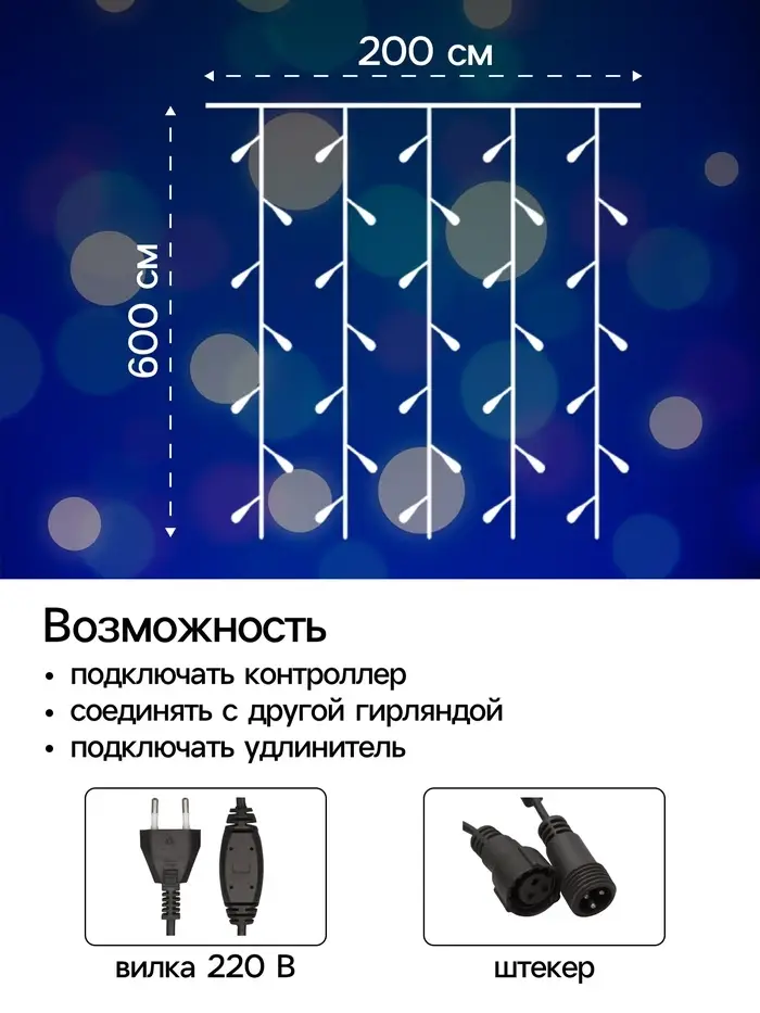 Гирлянда «Бахрома» 3×0.6 м, IP44, УМС, прозрачная нить, 160 LED, свечение синее, мерцание белым, 220 В