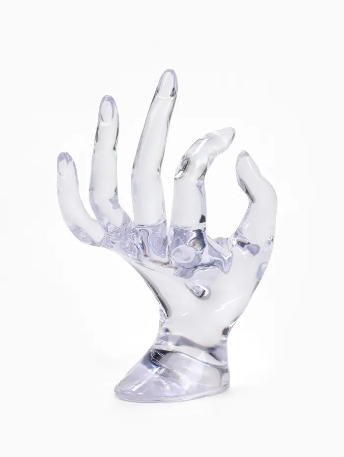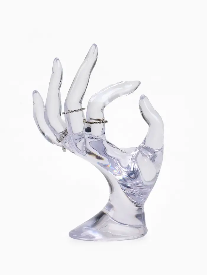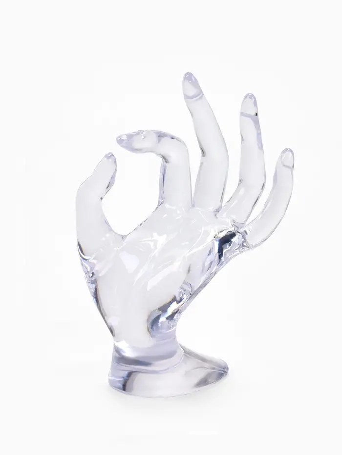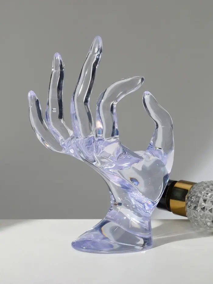 Этот кристально прозрачный аксессуар в форме изящной кисти руки превращает хранение ваших украшений в невесомую художественную инсталляцию. Отсутствие цвета позволяет подставке полностью раствориться в интерьере, выдвигая на первый план блеск металла и сияние камней ваших любимых изделий.