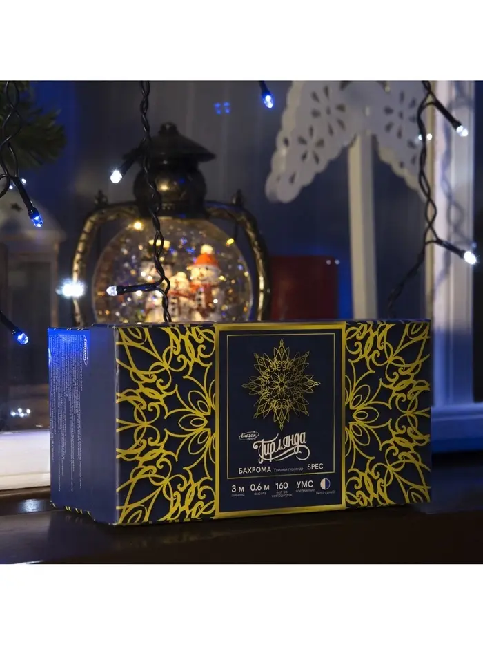 Гирлянда «Бахрома» 3×0.6 м, IP44, УМС, тёмная нить, 160 LED, свечение бело-синее, мигание, 220 В