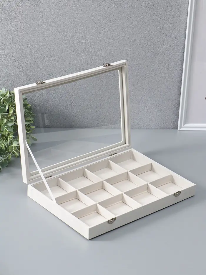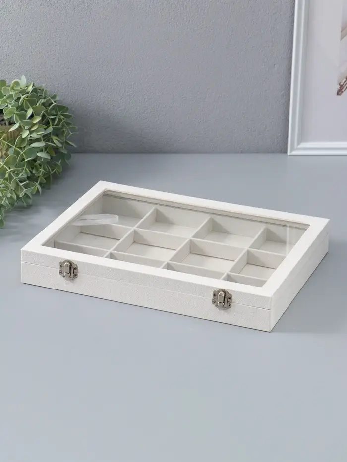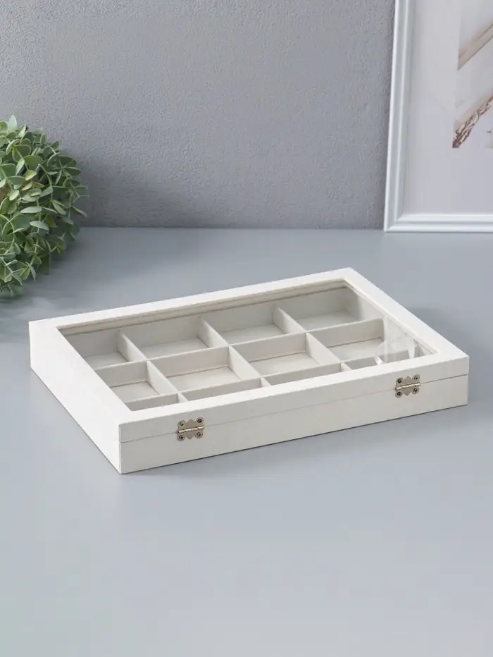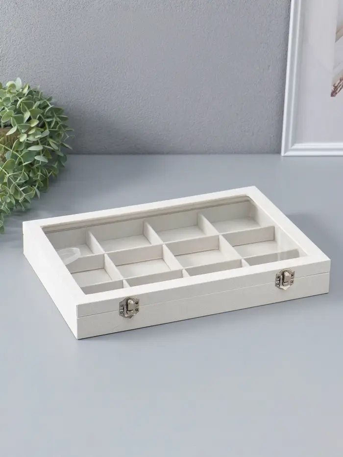 Элегантная шкатулка с 12 ячейками и прозрачной стеклянной крышкой — идеальное решение для аккуратного хранения украшений и мелких аксессуаров. Бежевая палитра в сочетании с мягким флоковым покрытием внутри создаёт атмосферу уюта и изысканности, позволяя бережно хранить ваши драгоценности и сохранить их первозданный вид.