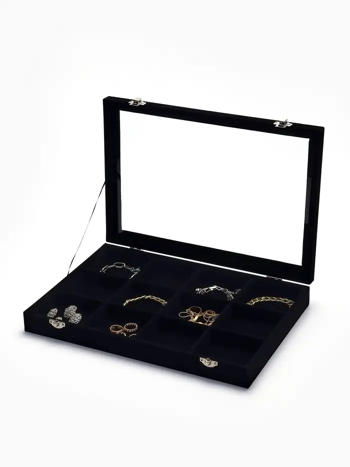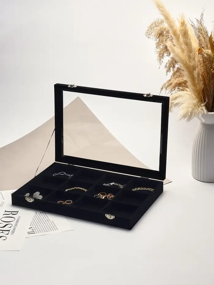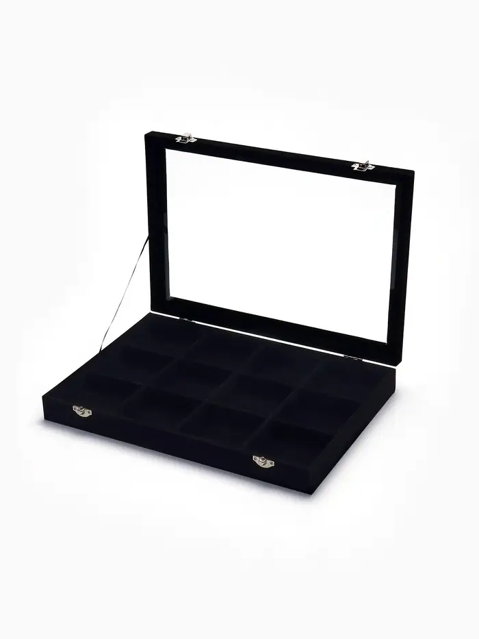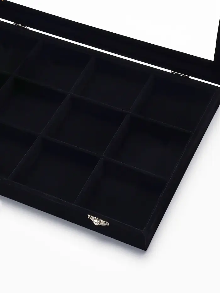 Черная шкатулка с 12 ячейками и стеклянной крышкой — это продуманное сочетание стиля и функциональности для хранения ваших украшений. Благодаря лаконичному дизайну и универсальной прямоугольной форме она легко впишется в любой интерьер, придавая вашему пространству нотки элегантности и порядка.