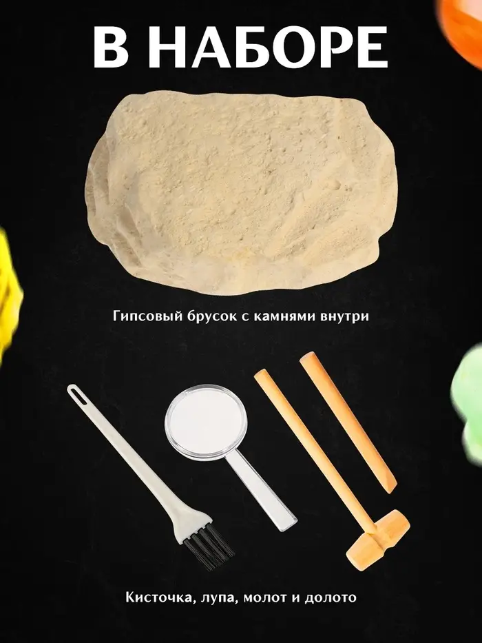 В наборе: долото, кисточка, лупа, гипсовый объект с кладом внутри.