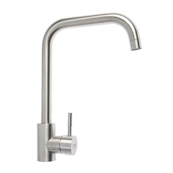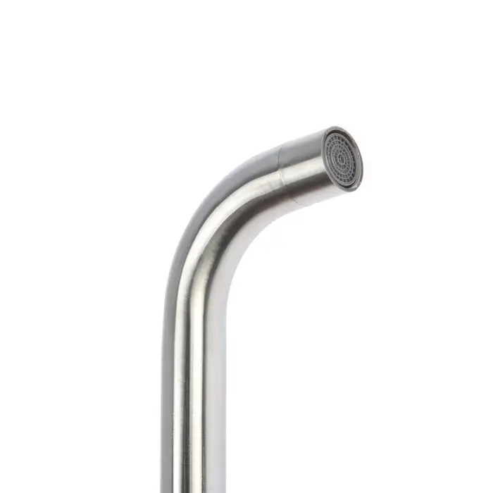 Однорычажный смеситель с высоким изливом, сатин — кухонный смеситель из нержавеющей стали. Г-образный излив, рычажное управление и матовое покрытие.