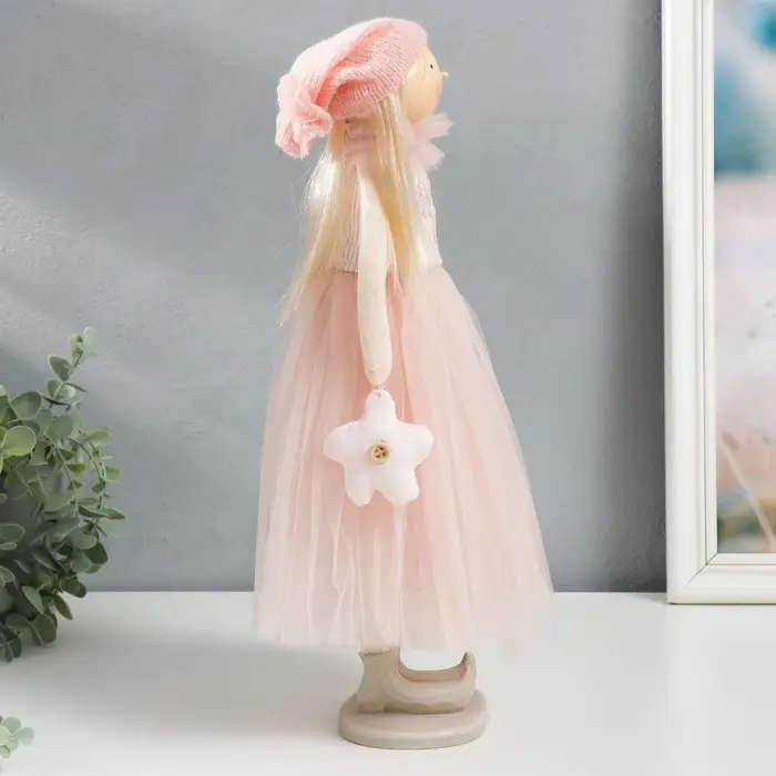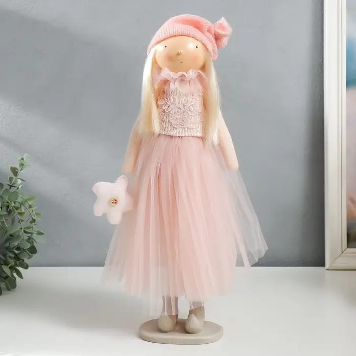 Откройте для себя удивительный мир игрушек с интерьерной текстильной куклой, которая станет настоящим украшением любого уголка вашего дома. Эта очаровательная девочка в розовом наряде с длинными волосами и цветком в руках не только привлекает внимание, но и создает атмосферу тепла и уюта, высота куклы составляет 41,5 см.