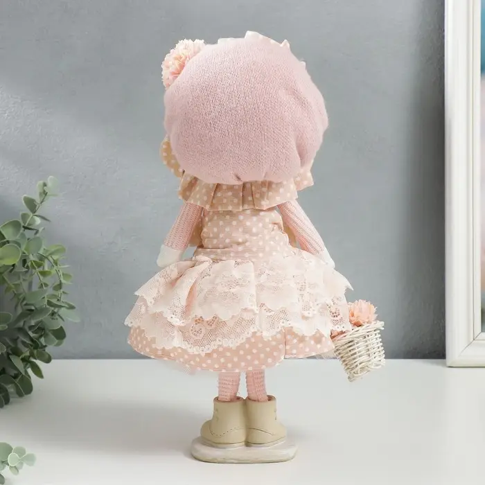 Интерьерная кукла текстильная «Малышка в чепчике и платье в горох, с корзиной цветов», 36×14×16 см