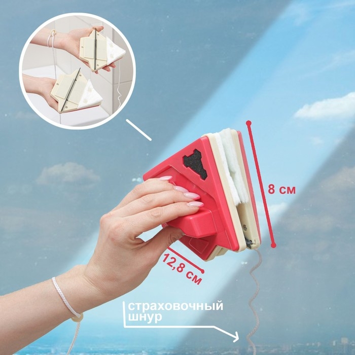 Магнитная щётка для мытья окон с двух сторон Доляна, треугольная, с водосгоном, на стекло 3-8 мм