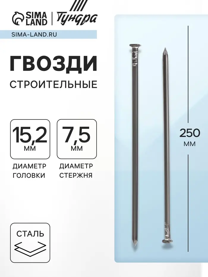 Гвозди ТУНДРА, строительные, ГОСТ 4028-63, без покрытия, 7.5×250 мм, 5 кг