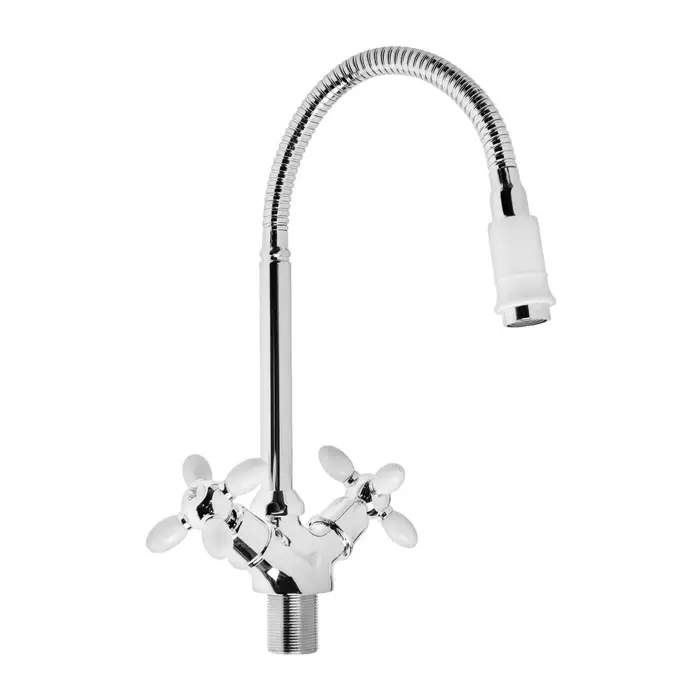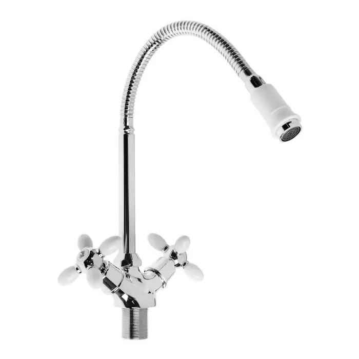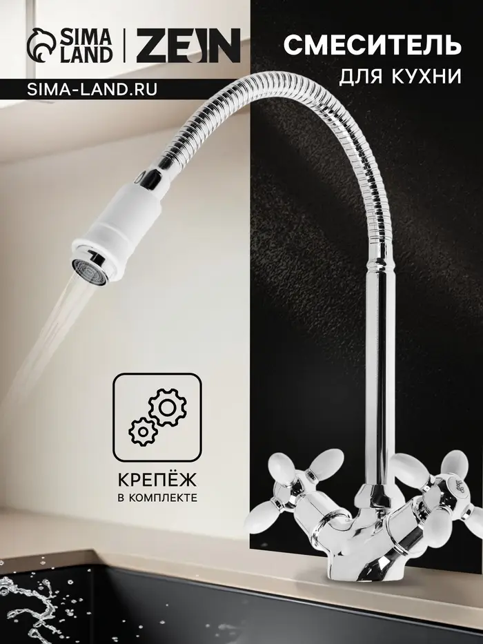 Смеситель для кухни ZEIN ZC2033, гибкий излив, кран-букса латунь 1/2", белый/хром