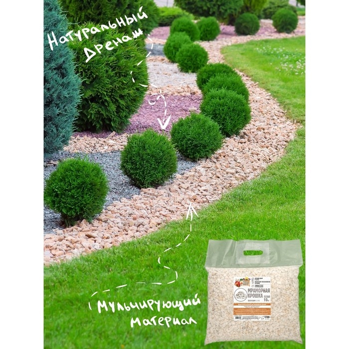 Помимо декоративных свойств, мраморная крошка используется в качестве мульчирующего и дренажного материала. Мульчирование мраморной крошкой позволяет уменьшить перегрев земли и поддерживать оптимальный уровень влажности и рыхлости почвы. Мраморный щебень – эффективный элемент дренажной системы. Материал способен отвести излишки воды, тем самым избежать подтапливание, заболачивание и предупредить гниение корней растений.