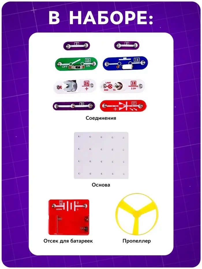 Экспериментируйте и создавайте электрические устройства самостоятельно. В наборах вы найдёте подробную инструкцию с описанием каждого шага. Конструктор «Эврики» предназначен для сборки различных простых электронных схем. Соединение элементов между собой производится с помощью специальных кнопочных креплений — это удобно, легко и быстро. Собранные схемы не требуют настройки и начинают работать сразу.