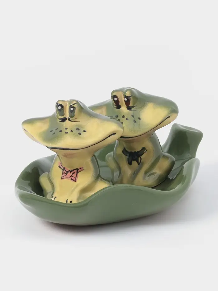 Набор для специй Кунгурская керамика «Лягушки», 2 предмета на подставке: солонка, перечница, зелёная
